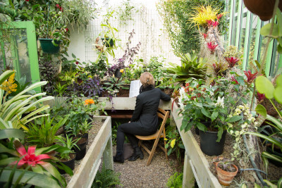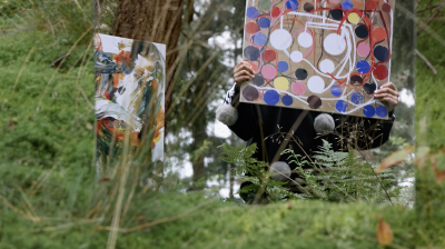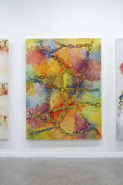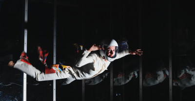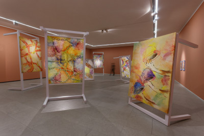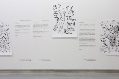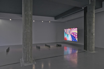 First of all, Fernandes clearly gives modern art a rough ride. In a counter-expression to the fine art tradition that she takes as her subject matter, Fernandes’ video Never Touch the Ground (2020) mimicks the form of a TV show. Donning costumes and props that colourfully quote masterpieces of twentieth century art, the artist here pursues – or performs – the link between leisure culture and abstraction by counter-intuitively accompanying the viewer through play sculptures, theme park attractions, and a skydive centre. Fernandes puts herself on the line, in an immersive meditation on the role of the artist: her exalted mediator is a kind of twenty-first century, bubble gum caricature of the clichéd passionate artist that realizes her unbounded imagination. Wonderfully, there are also sequences in the film acted out by puppet mice, manically engaged in artistic activities. Why mice? We are close to an unhinged sense of the ludic here, in the absence of human actors.